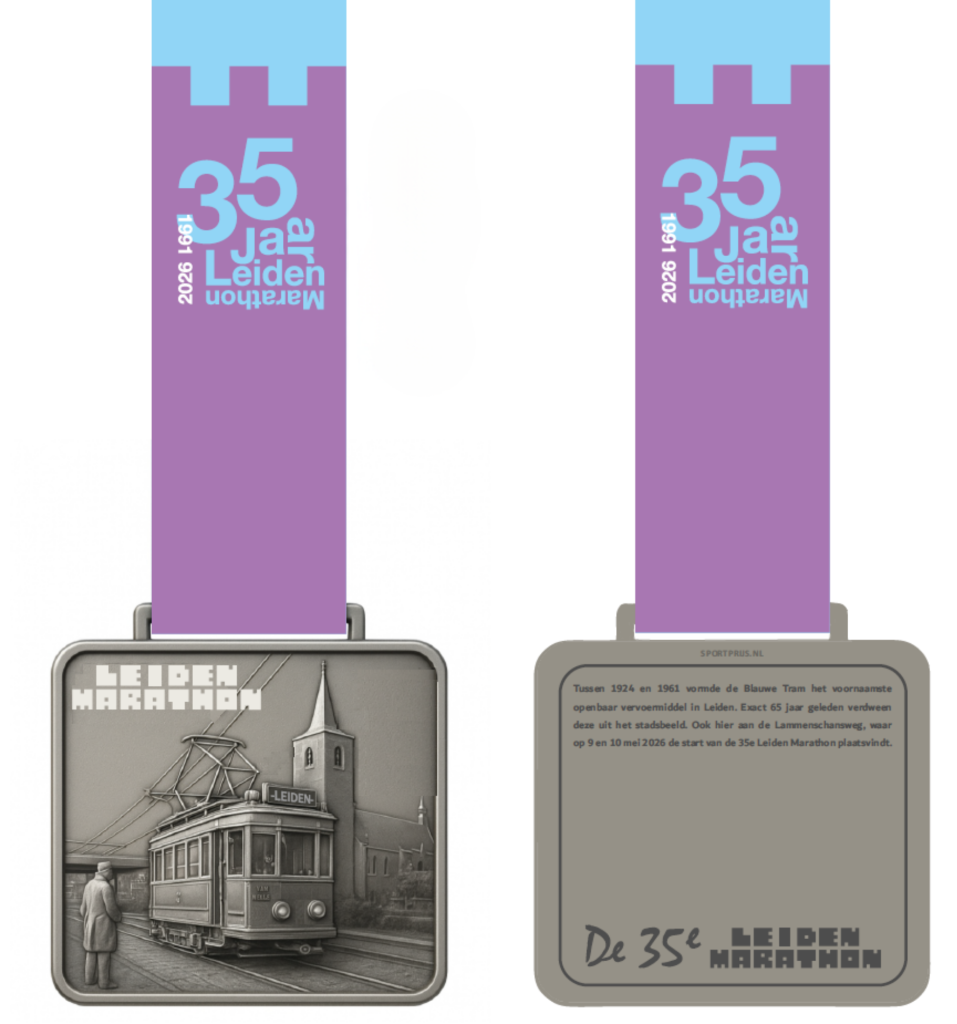 The Leiden Marathon is celebrating its 35th edition, and we’re doing so with a unique medal that embodies a piece of Leiden’s history. The Blue Tram, the face of Leiden’s public transport system for many years, graces the front. The medal is why you run and that’s why we make it so beautiful. And this is why we offer you an engraving service. Because what is more fun to engrave your new record on it? You can simply add this to service during registration for € 10,00 (or € 11,00 on May 10).